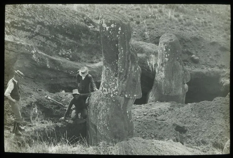 Это значит только одно: не было нынешних замечательных статуй в эти посещения, первое реалистичное изображение появилось только в конце 1870-х годов. А первой работой, познакомившей широкий круг читателей с реальными статуями, стала книга The Mystery of Easter Island: The Story of an Expedition, изданная Кэтрин Рутледж (1866-1935) в 1919 году.