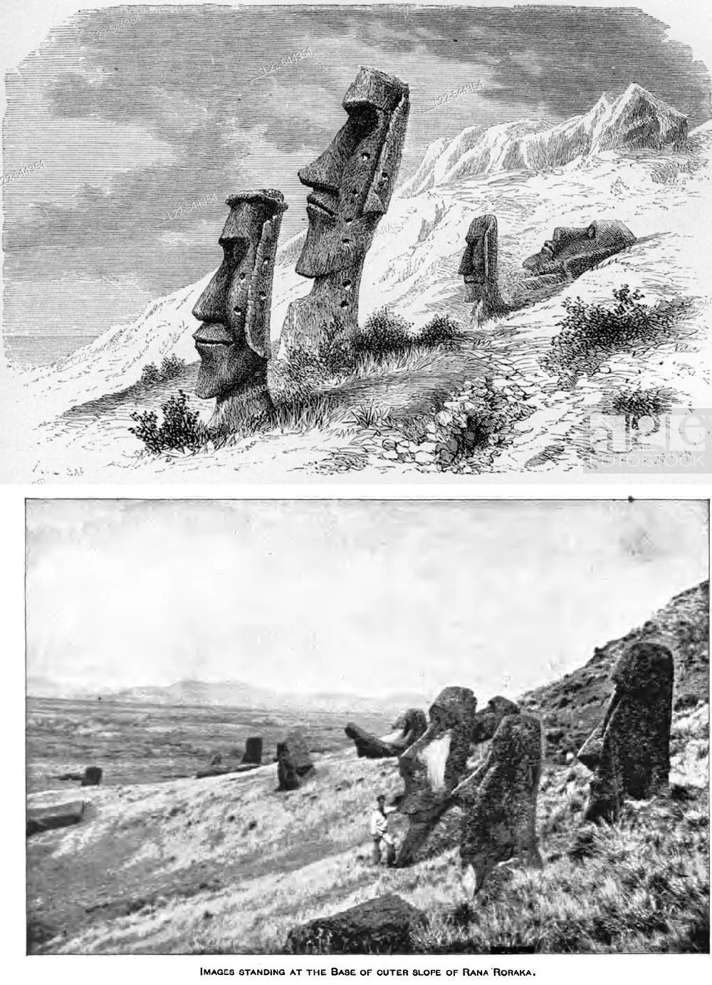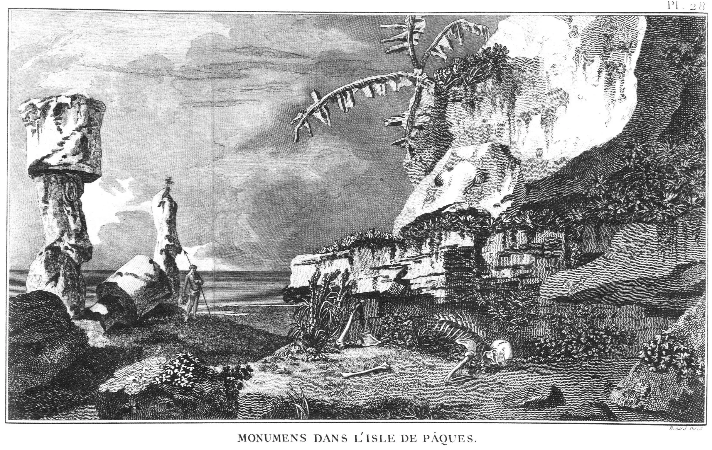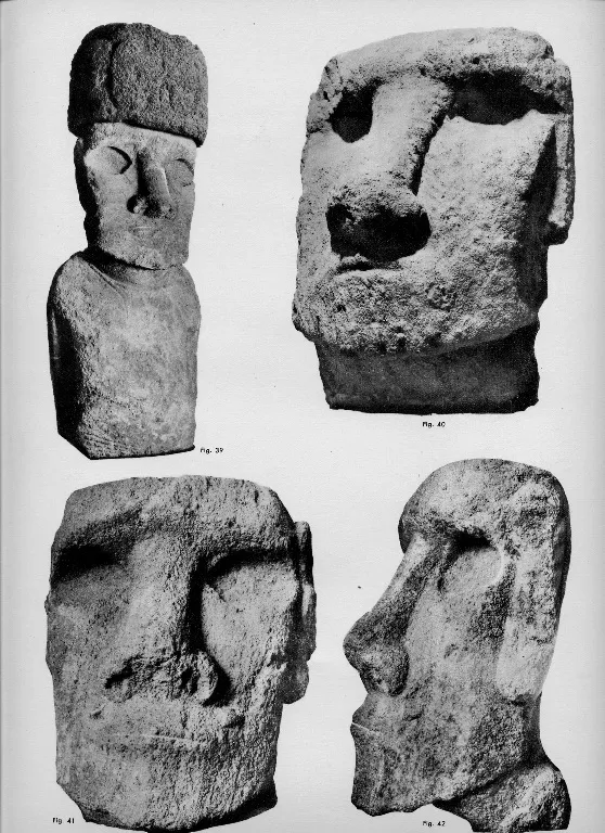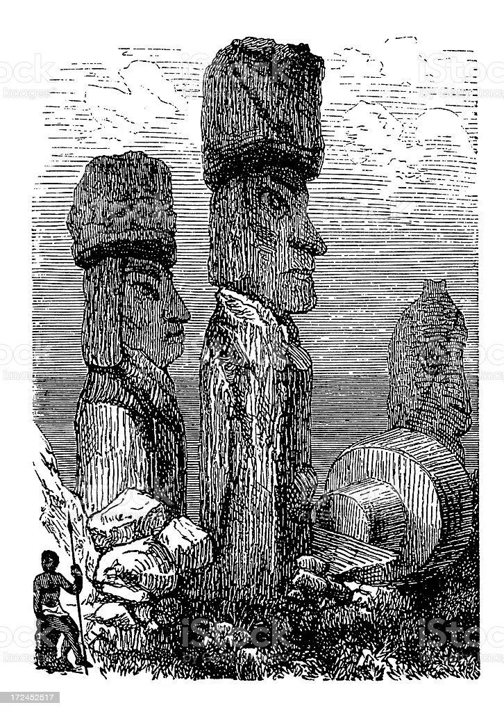 Изображение статуй скопировано с рисунка де Ванса, члена экспедиции Лаперуза, описание — с перерисовок фантазийного рисунка Ходжеса, члена экспедиции Кука.