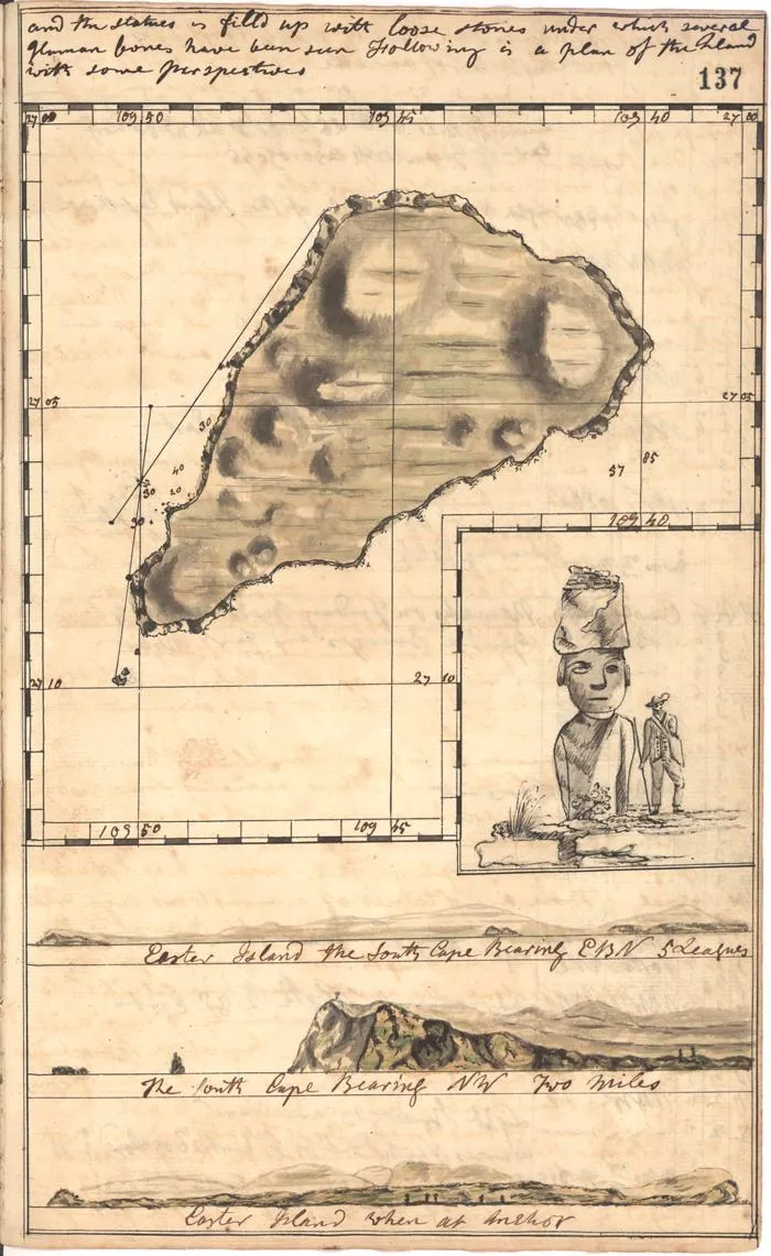 Map and sketches of Easter Island from J Gilbert`s log of the voyage of HMS Resolution through the Pacific from 1772-5..