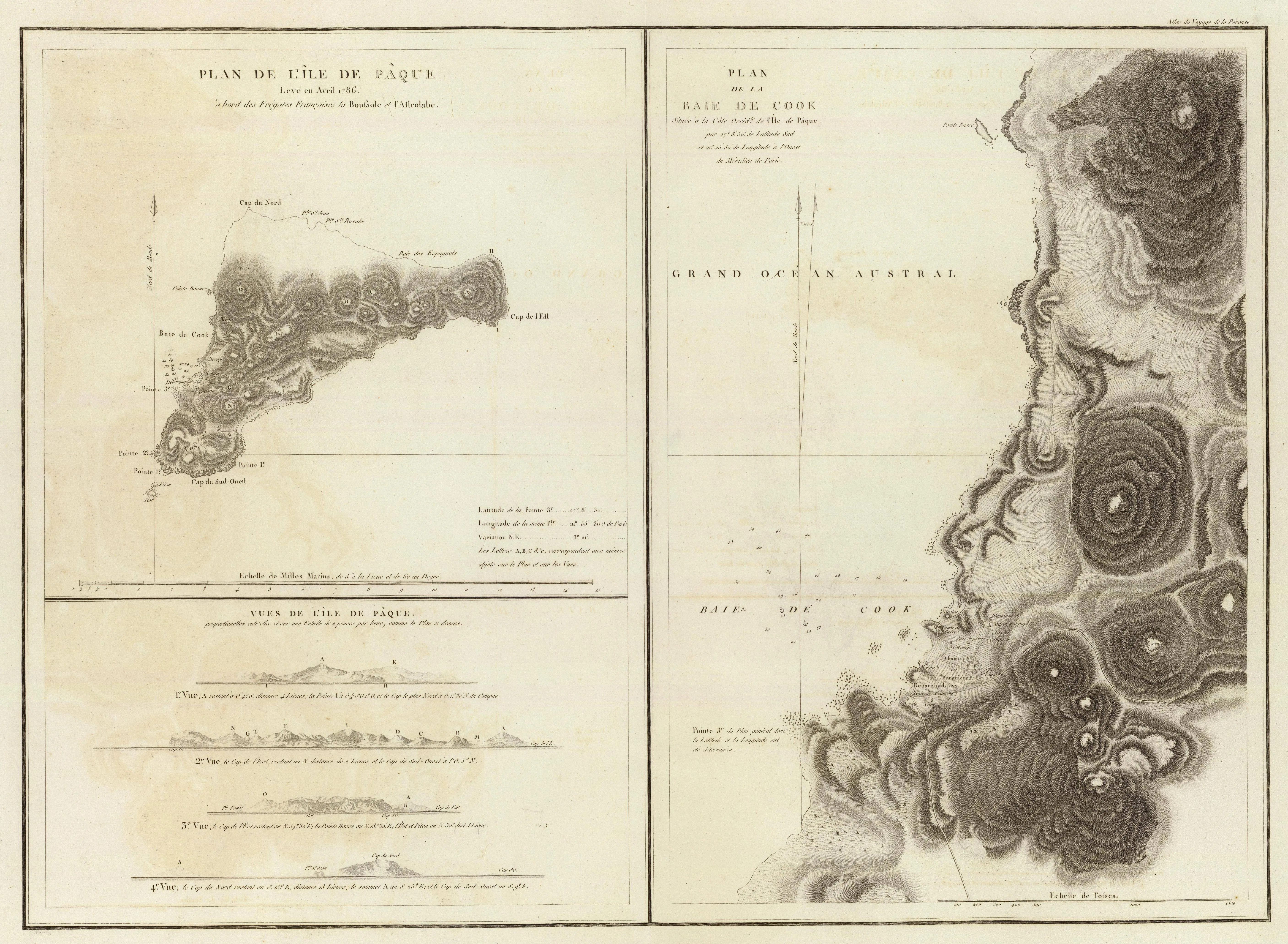 Интересно, что на карту хорошо изученной западной части острова Лаперуз нанес даже отдельные деревья - редкость для острова. Гигантским статуям места не нашел. Открывайте полный размер и любуйтесь.