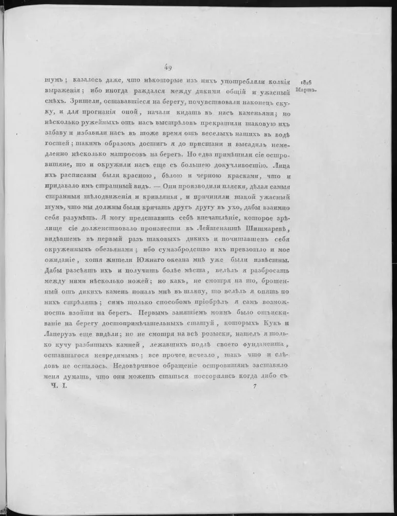 "Очень сожалел я, и досадно мне было, находясь в виду острова, не побывать на нем, не осмотреть тех важных документов прежней жизни островитян, которые делают о. Рапа-Нуи единственным в этом роде изо всех островов Тихого океана. Мне было тем более досадно, что путешественники (Очень многие мореплаватели посетили о. Рапа-Нуи. Начиная с Роггевена, открывшего остров 24, Кук, Ла-Перуз, Коцебу 25, Крузенштерн 26, Бичи, Дю-Пти-Туар 27 и другие рассказывают о своем пребывании на этом острову, но все описания и изображения более чем недостаточны, если захочешь получить понятие об этих памятниках, а не удовольствоваться сообщением, что на о. Рапа-Нуи находятся большие каменные идолы 28. Очень вероятно даже, что, помимо колоссальных каменных фигур, на острову найдутся не такие громадные, но не менее интересные древности 29), видевшие эти [61] замечательные памятники, только смотрели на них глазами удивления или равнодушия, и ни один из них не постарался подробно и внимательно изучить эти достопримечательные образцы полинезийского искусства, которые до сих пор остаются почти столь же неизвестными, как и в 1721 г. (Ошибка в рукописи. Следует: в 1722 г), когда Роггевен первый описал их.