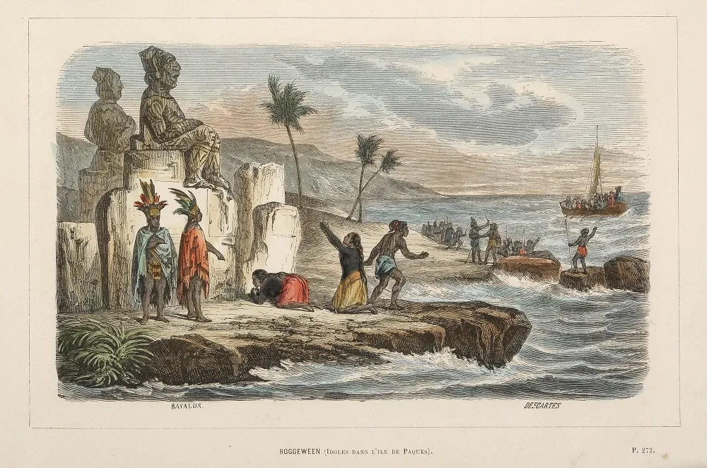 "Идолы острова Пасхи". Воспроизведение оригинальной гравюры (16,3 х 26 см, Баялус и Декарт, сделанные во время экспедиции Якова Роггевена, 1722), сохранилось в коллекции Национального Исторического музея.