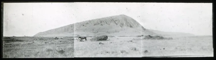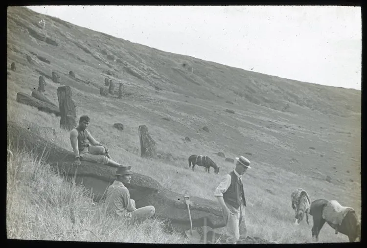 Имея фотоаппаратуру, экспедиция Томсона почему-то не пользуется ею для съемки моаи, кроме единственного раза. Разумеется, это то место на склоне, где первые моаи появились в 1877 году у Пинара. Статуй, как видим, ощутимо прибавилось.