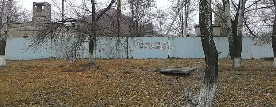 Надпись: «Спасибо ополченцам — нашим защитникам!» На заднем плане террикон на территории «Краснодонугля» — одного из крупнейших угольных предприятий на территории Украины