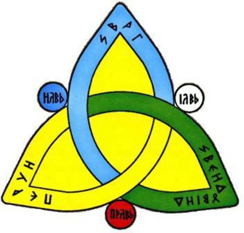 Великий Триглав Мира Яви - Сварогъ, Перунъ и Свентовитъ, которые дают людям Великой Расы - Совесть (Сварогъ); Свободу (Перунъ); Душевность (Свентовитъ).