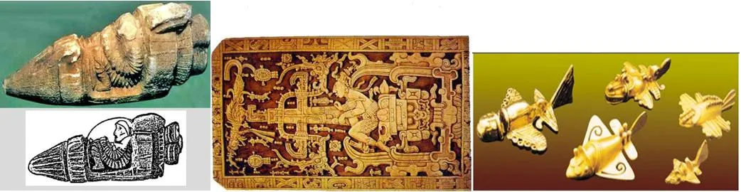 III. В пирамиде Мексики найдено захоронение с изображением на плите человека, сидящего за пультом управления аппарата. Самолётики из храма Чечен-Ица. VI в.