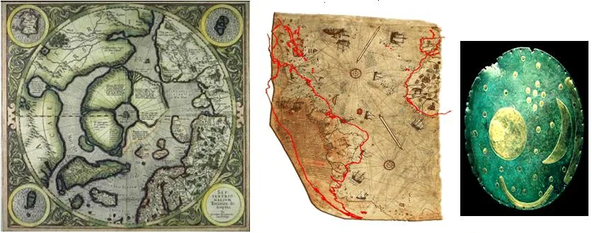 IV. Древние карты Меркатора XVI в., Антарктиды и «Небесный диск». На этих картах нанесены точные изображения Артики и Антарктиды. Они в точности соответствует описанию этих континентов в Ведах. Но заметь те, что эти материки изображены без льда. А без льда эти материки были сотни тысяч лет назад, когда согласно современной науке человека ещё в природе не было. Точность изображённых материков, которые сегодня находятся под километрами льда и океана, подтвердили современные аэрокосмические снимки. Учёные однозначно заявили, что такую точность не могли сделать древние без спутников. Авторы этих карт в XVI.в. указывали на то, что они списали их с более древних карт. Карта с изображением 3-ёх лун вокруг Земли, была найдена на берегу