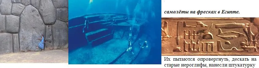 с новыми иероглифами. Часть из них отпала, образовав точные копии (подводный город-пирамида в Японском море, по размерам равный Риму) технических объектов! Вы в это верите? Где следы отпавшей штукатурки,разница в глубине оттисков, в цвете и т.д Инки и египтяне в своих мифах, говорят о белых Богах, которые пришли к ним с сеВера и построили пирамиды. Но «официальная» наука упорно не обращает на это внимания и по её версии всё сделали люди с молотком и зубилом. Изображения в пустыне Наска(Перу) протяжённостью в несколько км. Увидеть изображения можно только с самолёта (потому их обнаружили только в XX ст.) Значит делались они для тех, кто умел летать. Были найдены «спиленные» горы, взлётно-посадочные полосы в горах, сделать которые не способны даже сегодня. Ученые Российской академии наук Института космических исследований определили, что эти рисунки создавались с высоты 40 км. огромным источником энергии который превращал камни в песок. Гигантские отшлифованные камни Баальбека. V в. до н.э. не способны поднять современные краны. Каменная плита с объёмным изображением Уральского региона была найдена учёными Башкирского государственного университета в 1999 г. в деревне Чадар. В фильме «Каменная плита Сибири» показано, что карта подписана не китайскими иероглифами, как по началу думали учёные, а русской руницей. Такие же руны были найдены на раскопках в Костенках (г. Воронеж) 45 тыс. лет. Чадарская карта состоит из прочнейшего доломита и диопсидового стекла. Технология его обработки науке неизвестна, говорит доктор физико-математических наук, профессор А. Чувыров. На карте видна гигантская оросительная система региона- чудо инженерной мысли.