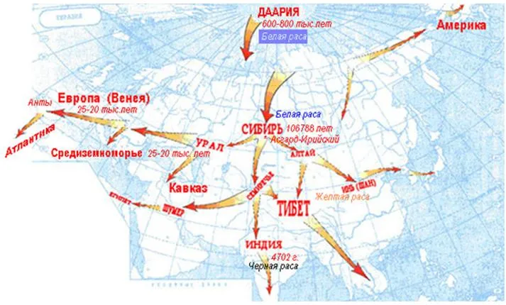 Материк, на который приземлились расичи на Мидгард-Земле, был назван звёздными путешественниками Даарией - Даром Богов. Этот материк находился на Русском Севере (Се вера). Священная Страна Дария (Арктида) была разделена реками на четыре части по количеству Родов Святой Расы: Раи, Туле, Свага и x'Appa. Все четыре реки стекались во внутреннее море. В море находился остров, на котором стояла гора Мира (Меру). Мидгард-Земля имела 3 луны. Ближайшей к Земле луной была Леля. Период её обращения 7 дней. Луна Фатта - 13 суток и Большая луна - Месяц - 29,5 дней. Это подтверждают археологические находки. К тому же наука установила, что ещё 13 тыс лет назад, тропический климат был не в Африке, а на Севере. В ходе бурильных работ проводимых геолого-разведочными экспедициями, нефтяными компаниями «British Petroleum», «Газпром» и др. было найдено огромное количество останков тропических растений и животных в районе Северного Ледовитого океана, как на материковой части так и под водой в горных породах. Результаты работ и находки размещены в музеях, вошли в учебные пособия Географического общества АН СССР, Расии. (Кондратова, Д. Квасова, В. Томирдиаро, Б. Чернявского). .Поэтому негры чёрные не из-за климата в котором они живут (см.стр.15).