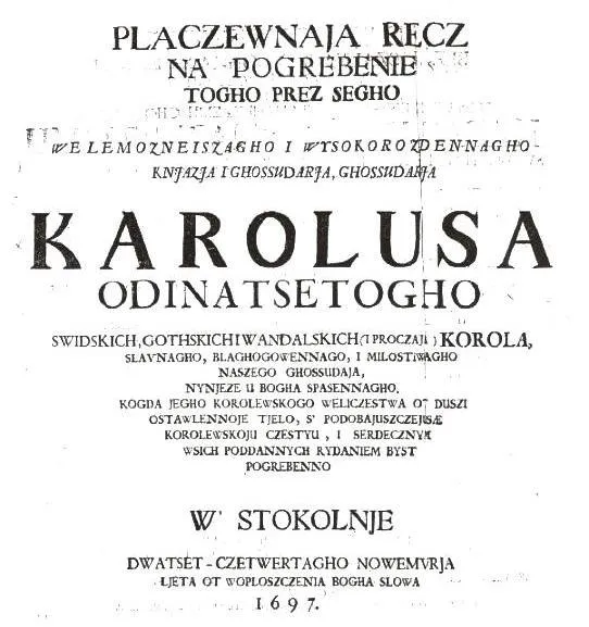 «Placzewnaja recz na pogrebenie togho prez segho welemozneiszago i wysokorozdennagho knjazja i ghossudarja Karolusa odinatsetogho swidskich. Документ сохранился в кодексе из Библиотеки Уппсальского университета, Собрание Palmkiold 15 стр.833. Еще один экземпляр, хранится в Королевской библиотеке Стокгольма. Вытеснение славян с Европы началось именно с вытеснения русского языка. Стали создаваться национальные языки и вместо прежней буквицы стали внедрять недавно изобретённую латиницу. В результате слова стали искажаться. Но Древний свенскмол, свейска мола (молва свенов) или шведский язык сохранил чисто русские суффиксы как-SK, например, RUSSISK, или SVENSK, или NORSK.