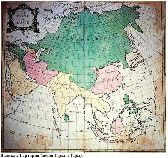 Романовская история учит нас, что это Иго закончилось в 1480 г. Однако на всех европейских картах XVIII ст. и на сохранившихся от зачисток, русских картах большая часть территории Российской империи, включая Монголию, часть Китая, Индии называлась: GRANDE TARTARIE, то есть Великая Тартария. “Монголо-Татарская” Империя - существовала вплоть до захвата власти немцами Романовыми. А прейдя к власти Романовы сотворили политическую сказку о “плохих монголо-татарах», кочевых ордах из Азии установивших Иго. "Иго" – это русское слово означало порядок, отсюда имя "Игорь" - хранитель порядка "Монголия" (Моголия) иностранцы называли Русь, от греческого "Мегалион", т.е. "Великий".Слово “орда” на древнерусском означало «светлое войско». Руна “ОР” означала "силу", руна “ДЕН” - "свет". Слово “Орден” исказили латиняне на "орда", так появилась Великая Орда. Орда - это войско или военное поселение вроде наших казачьих станов. Слово «Стан» мы встречаем с приставками «Таджики-» «Узбеки-», и т.д. Спроси любого узбека: «Как переводится «Стан» в слове «УзбекиСтан»? И он вам не ответит, потому что нет этого слова в узбекском языке. А происходит оно от древнерусского глагола «ста» (стоять). Отсюда: станица, становище, станок и т.д. Значит это были наши территории, которые как изображено на древних картах входили в состав Тархтарии.