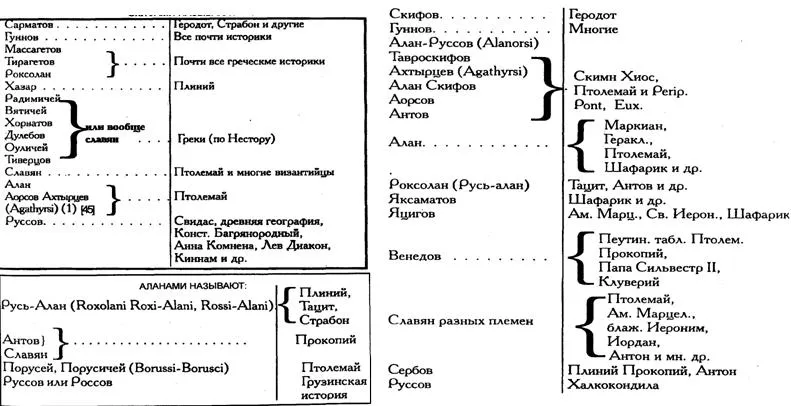 Если взять всех историков и все названия народов о которых они писали: Арии, Скифы, Гунны, аланы, сарматы и пр. то мы увидим, что это всё, названия одного народа - русского, который в разные времена, разными историками назывался по разному. Е. Классен «Новые материалы для древнейшей истории славян…».