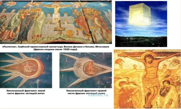 как может Царствие Небесное иметь размеры и форму куба? На многих древних иконах были изображены НЛО. Например «Троица держит Землю». Разве этот шар с антенами и пробкой внизу похож на Землю?
