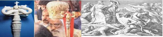 Влияние змей нашло отражение в символике многих религий например: «Патриарший жезл со змеями». А теперь вспомните из Библии. Числа 21:8 «И сказал Господь Моисею: сделай себе змея и выставь его на знамя, ужаленный, взглянув на него, него останется жив»..