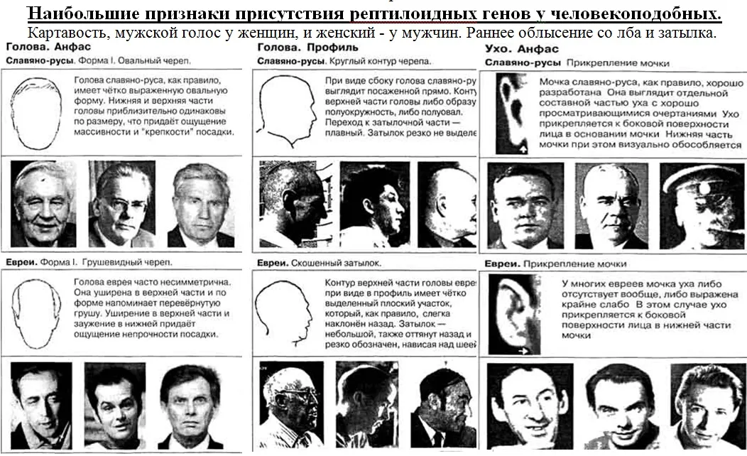 Скошенная улыбка или оголение дёсен при улыбке. Загребущая нижняя губа. Редкие или неровные зубы. Голова посажена в шею. Квадратный тип подбородка. Брови сильно изогнутые, создающие выражение обиженного или молящегося. У славян тонкий волос, у рептилоидов более жёсткие, кучерявые, волнистые волосы. У женщин низкие груди и плечи шире таза (типичная западная фотомодель). Ненормальная сексуальная ориентация - как пережитки гермафродитизма у рептилий. Необходимость мужского обрезания. Плавное или резкое искривление носа. Заострение носа или задирание носа. Нос в виде наконечника стрелы. Глаза выпуклые. Хорошо видны верхние или нижние веки, напоминают глаза земноводного (жабы, ящерицы). Наличие под глазом хорошо просматривающегося желвака. Например Откуда якобы у украинца может взяться фамилия БАНДЕРА. Это фамилия не украинская. "Бандер" с иврита - содержатель борделя. Это босяцкое прозвище женщины, которая владела борделем. В старину таких женщин называли на Украине бандершами. Портрет самого Бандера не оставляет сомнений в его генетическом еврействе.