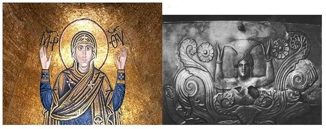 А это 3-4 тысячи лет до Рождества Христа. Получается, что как с Черниговскими храмами, так и храм Софии были языческими, а не христианским храмом. Знаменитые исследователи иконописи Павел Флоренский, художник Грело, свидетельствуют, что фрески языческой Богородицы Софии Премудрой в Константинополе и в Киеве, лишь в поздние времена стали подписываться именем еврейки Девы Марии. На древних иконах Софии и сегодня нет надписей с именем «Мария». То, что София Премудрая есть языческая Богиня свидетельствует тот факт, что в язычестве София всегда изображалась в образе женщины, Матери Мира, Земли Матушки. А Священный Синод Православной Церкви своим постановлением от 1722 г. запретил писать “образ премудрости Божия в лице некия девицы”. Это поставило священников в тупик – что делать с шедеврами древней живописи, изображавших Софию. И тогда священники стали ставить кощунственную надпись, что это якобы дева Мария. Имя Богини Софии стали использовать православные, чтобы загнать широкие массы славянского народа в христианство. Считалось, что почитание языческой Богини Софии поможет христианству хотя бы частично обрести не иудейское лицо, поскольку приходилось поклоняться еврейским именам Богу Яхве, еврею Иешуа Машиах(на греческом Иисус Христос), еврейке Марии, еврею Савлу. Чтобы затушевать иудейскую суть веры, создавались храмы, иконы, молитвы, посвященные Софии Премудрости Божьей. Христианские богословы пытались доказать, что под языческой Софией Премудрой следует понимать Мудрость еврея Исуса.1Кор.1:24.Но не сумев побороть языческие корни Софии, наместник иудейского бога Иван Грозный и Московское духовенство предприняли крестовый поход искоренить “Софийную крамолу”. 1/3 жителей Новгорода была убита.