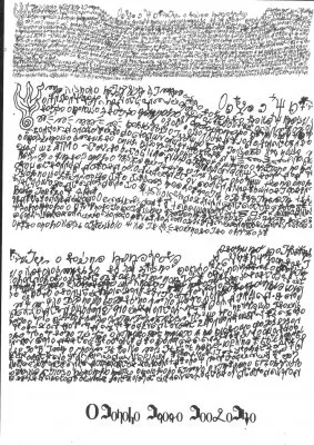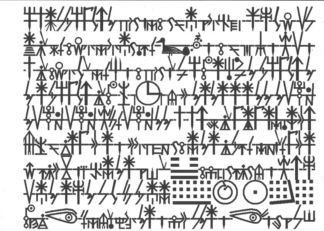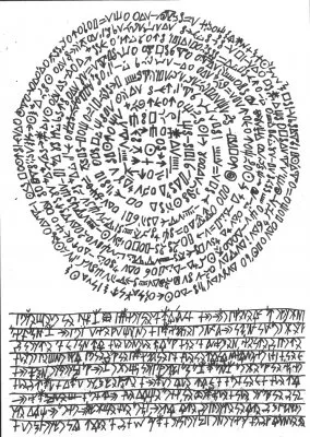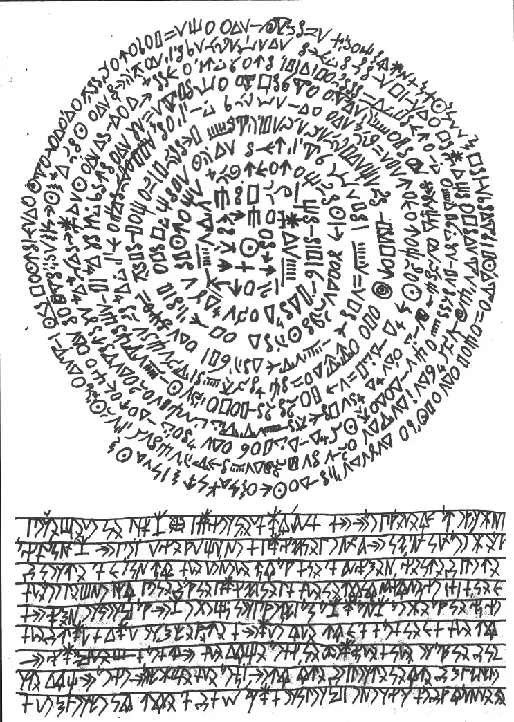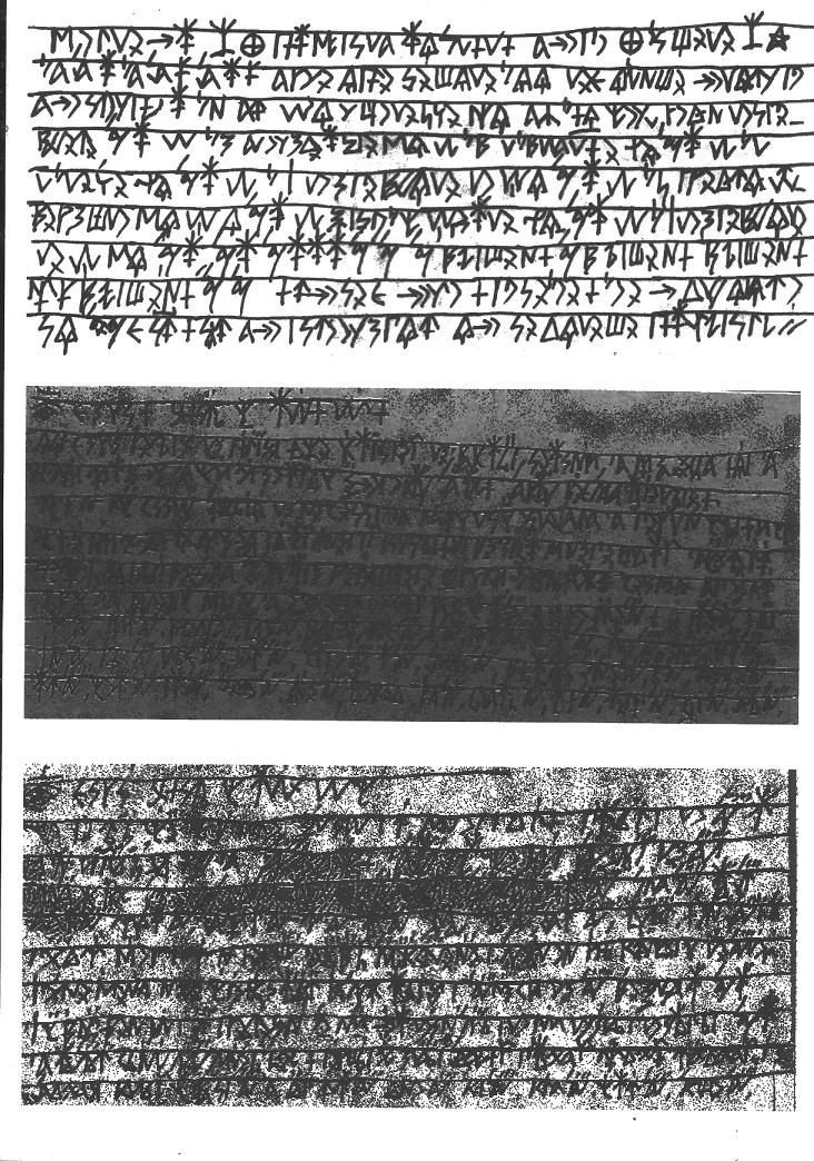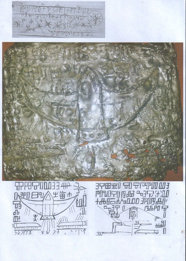 Первое изображение - фотография золотой пластины с изображение летающего аппарата, возможно, боевого самолёта (лицевая сторона),в низу листа - зарисованные изображения на лицевой и тыльной стороне , верхнее изображение - зарисовка на бумаге надписей тыльной стороны.